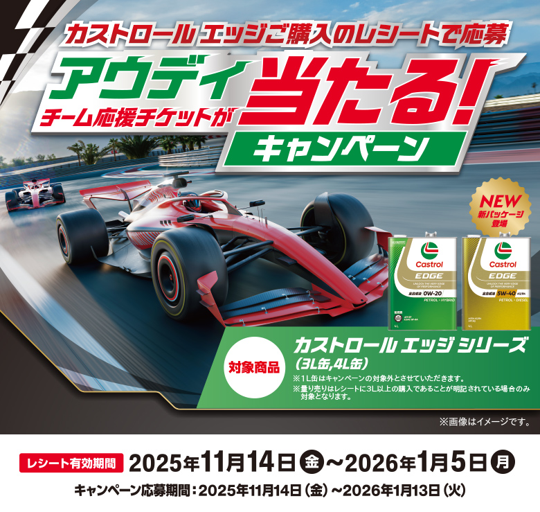 ご応募は「カストロール エッジご購入のレシートで応募 アウディチーム応援チケットが当たる!キャンペーン」キャンペーンサイトにて受付いたします。キャンペーン参加規約に同意の上、ご参加ください。
